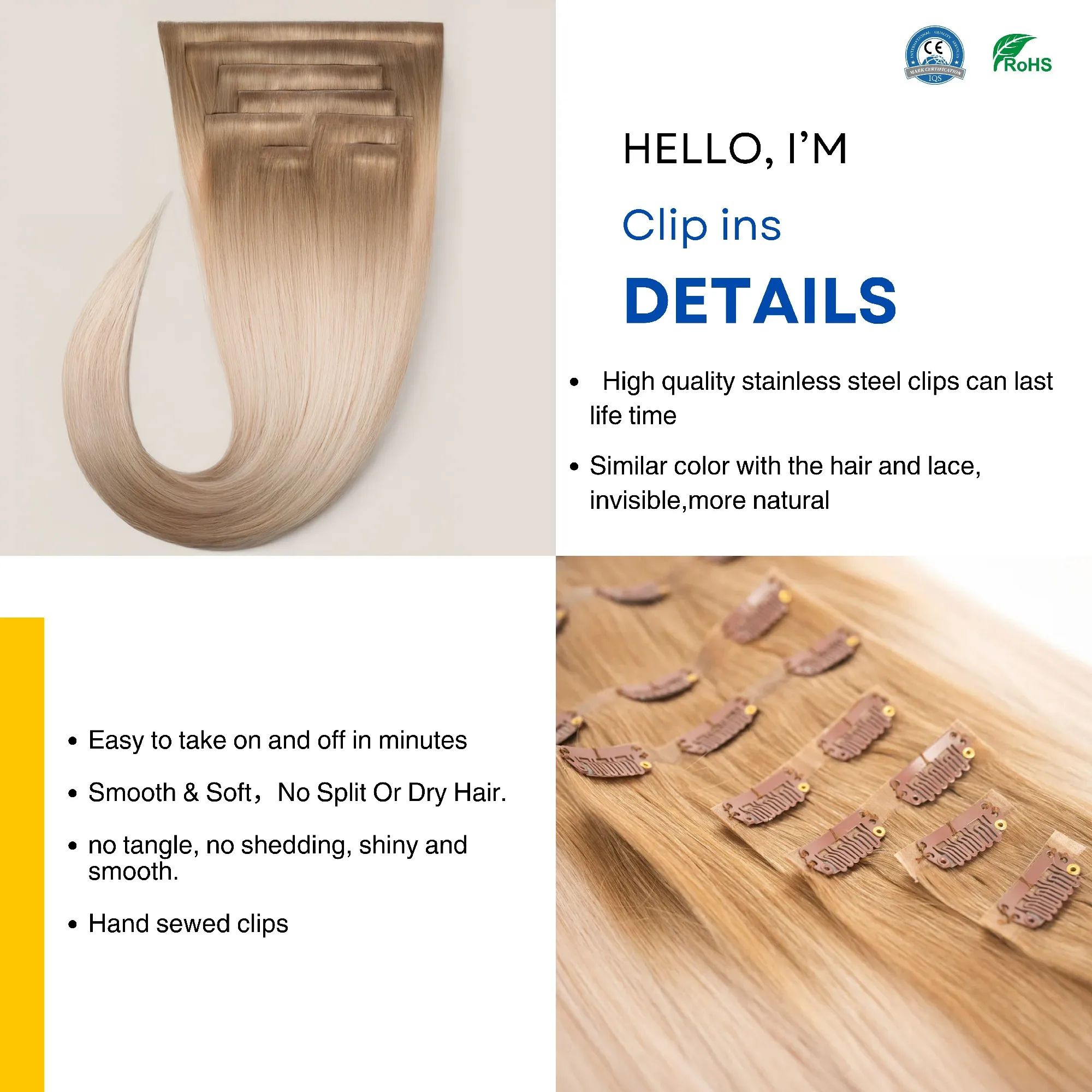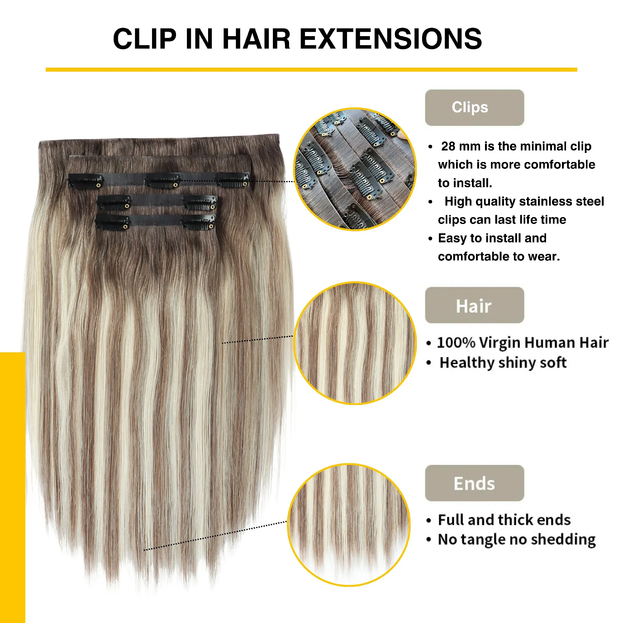 Seamless Clip-in hair extensions are a hair accessory that can be easily removed without causing any damage. They are simple and safe to use—no glue, heat, or professional styling required! Haohao Hair's clip-in extensions are made from the highest quality virgin hair. Designed to seamlessly blend with your natural hair, they instantly add length, volume, and style without affecting the look or feel of your own hair. Suitable for any occasion, our One Piece clip-in extensions are a must-have addition to every woman's hair accessory collection.